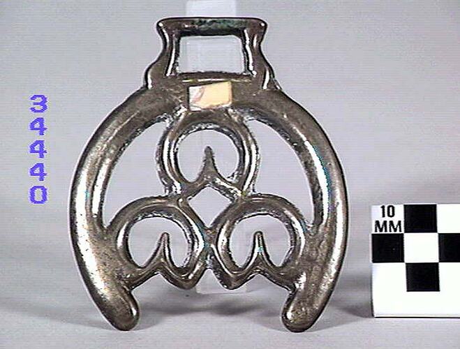 Horse brass depicting a horseshoe. Three small horseshoes surrounded by a larger horseshoe which is the border. Type: cast brass. Date: 1824-1939.