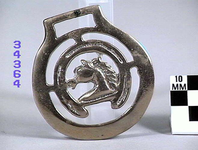 Horse brass depicting a horse head. Horseshoe inner border. Type: cast brass. Date: 1825-1939.
