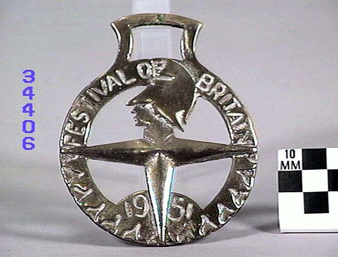 Horse brass commemorating the Festival of Britain 1951. Star in centre and soldier's head at top. Border marked "Festival of Britain 1951". Type: cast brass.
