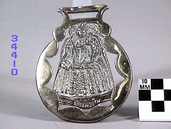 Horse brass: Commemorative, Queen Elizabeth I wearing a royal gown. Crenate inner border and a round outer border. Marked "Queen Elizabeth" on front underneath queen's feet. Type: cast brass. Date: 1825-1939.