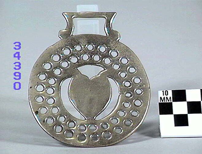 Horse brass: openwork with heart of shield in centre. Type: cast brass. Comments: item has the remains of one stud on back possibly from the casting process. There is some cracking at the base of the central design. Type: cast brass. Date: circa 1825-1939.