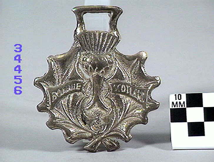 Horse brass: National emblem of Scotland. The thistle surrounded by two leaves. with the words "Bonnie Scotland" marked upon them. Type: cast brass. Date: 1825-1939.