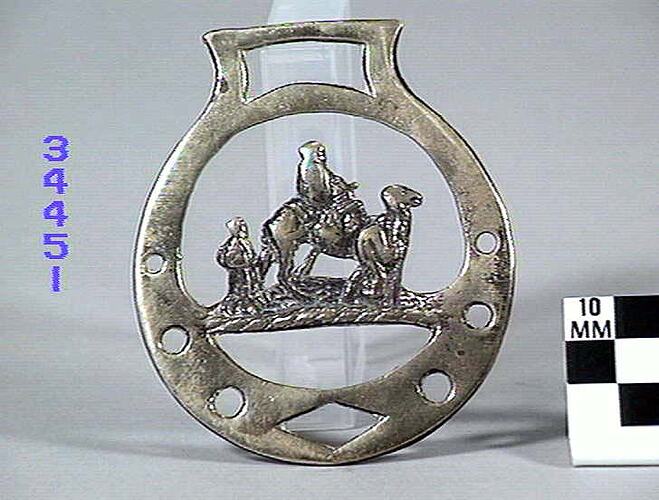 Horse Brass depicting a religious scene with two people either side of a man riding a camel. It is made of cast brass, which was not used until 1825. The crescent border is one of the oldest designs and was often used to frame other designs.