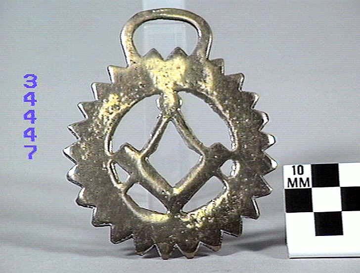 Horse brass: Masonic lodge symbol of the "dividers and square". Serrated border. Type: cast brass. Date: 1825-1939.