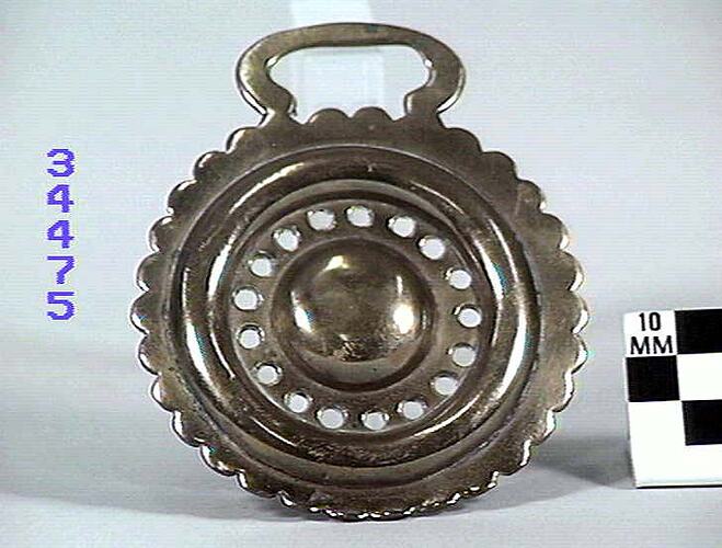 Horse brass: Sun disc with central hemisphere surrounded by 17 circular perforations and a raised border. Crenate edge. Type: stamped from brass plate. Date: 1825-1939.