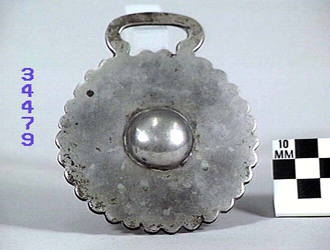 Horse brass: Sun disc, consisting of central hemisphere pressed out of a circular shaped brass. Crenate border. Type: cast from 'nickel silver' alloy. Date: 1840s-1939.