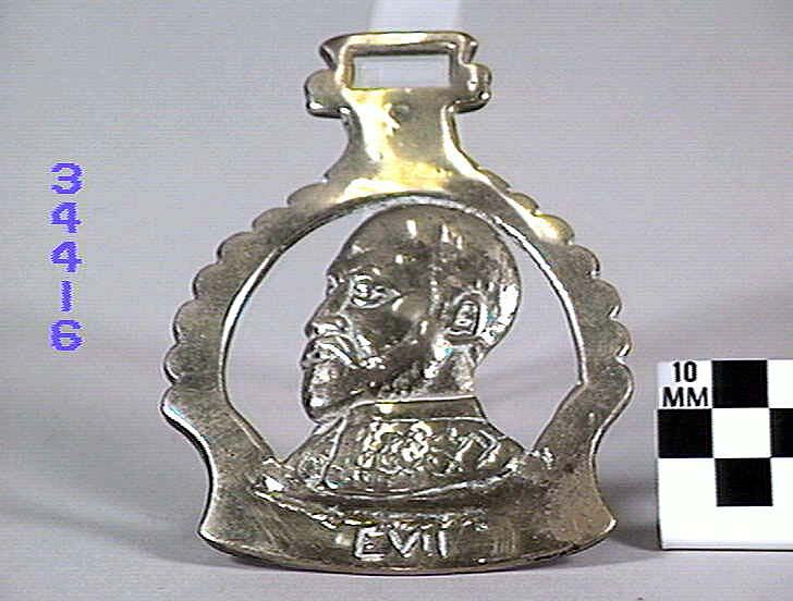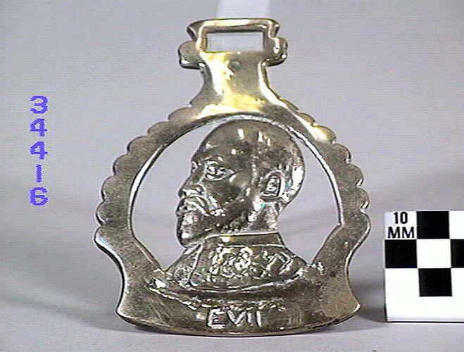Horse brass: Commemorative, Edward VII in centre. Border similar shape to a stirrup with a crenate edge. Marked "EVII at bottom". Type: cast brass. Date: 1901-1910.