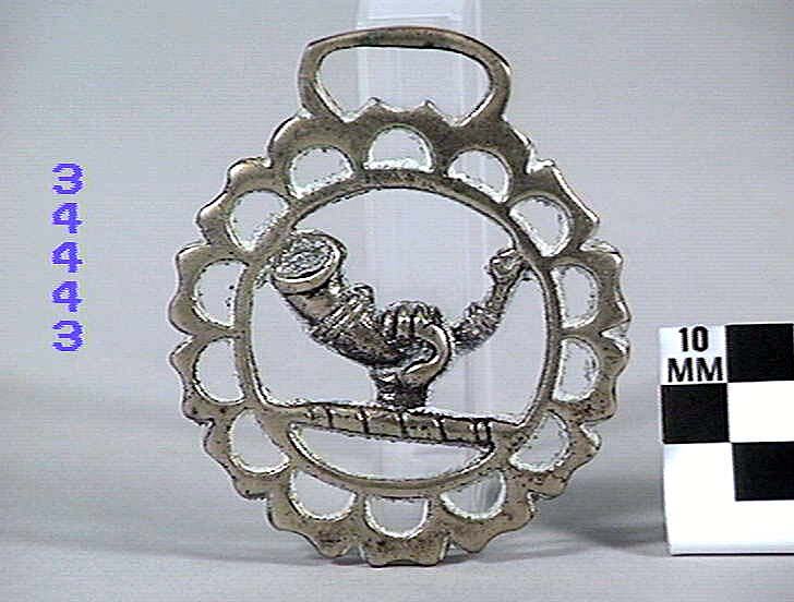 Horse brass: Hunting horn held upright by a hand, surrounded by a border with fourteen perforations and scalloped edge with indented tips. Type: cast brass. Date: 1825-1939.