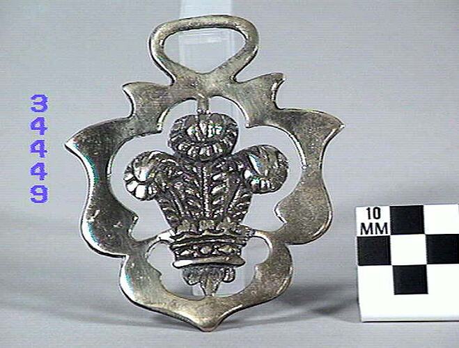 Horse brass: Prince of Wales' feathers, border in the shape of a shield. Type: cast brass. Date: 1825-1939.