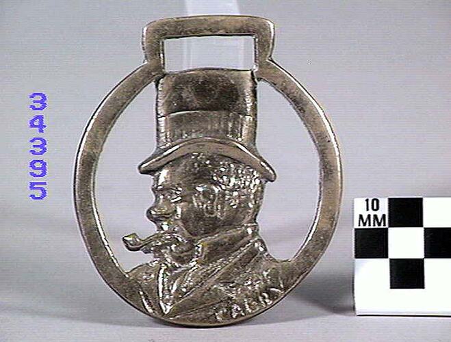 Horse brass: Cab driver. Circular border. Type: cast border. "The Cabby" is engraved on the front. Date: 1825-1939.