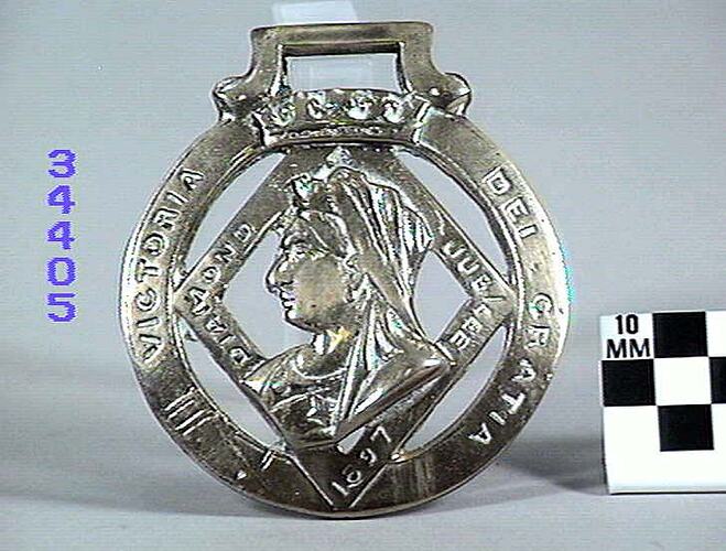 Horse brass: Commemorative, Queen Victoria Diamond Jubilee 1897. A diamond surrounding Queen Victoria's head. Type: cast brass. Date: 1897.