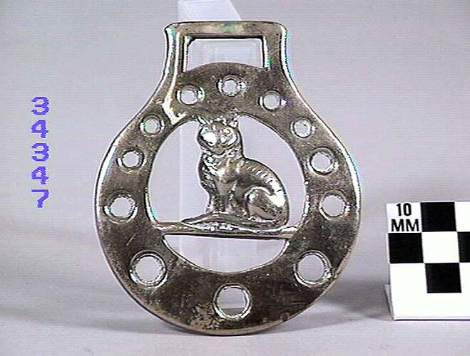 Horse Brass depicting a cat sitting. Round inner border and an outer crescent border with twelve perforations. Type: cast brass. Date: 1825-1939.
