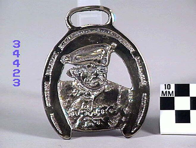 Horse brass. Pirate within a horse shoe. Type: cast brass. Date: After 1936.