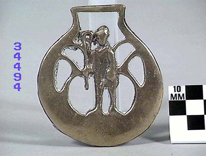 Horse brass: Shepherd and his staff. Circular border. Type: cast brass. Date: 1825-1939.