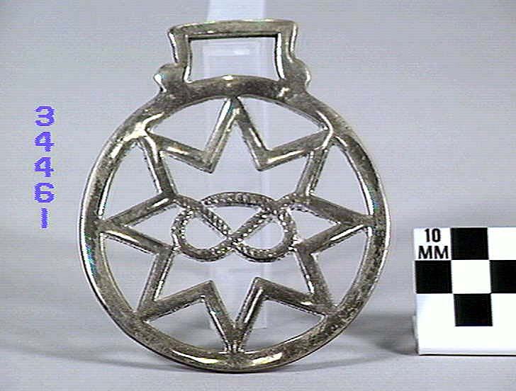 Horse brass depicting the Stafford family emblem. Stafford knot inside an eight- pointed star and surrounded by a round border. Symbol of Humphrey Earl of Stafford, 1425. Type: cast brass. Date: 1825-1939.