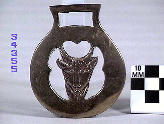 Horse brass depicting a goat's head with horns and beard. Inner border is in the shaped of a shield. The outer border is round. Type: cast brass. Date: 1825-1939.