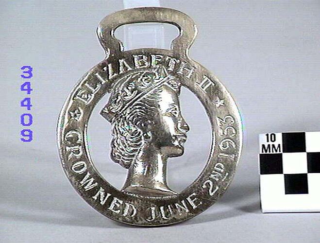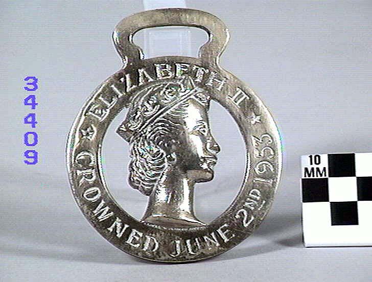 Horse brass commemorating the coronation of Queen Elizabeth II, 2 June 1953. Head of Queen Elizabeth in centre. Border marked "Elizabeth II crowned June 1953".Type: cast brass. Date: 1953.