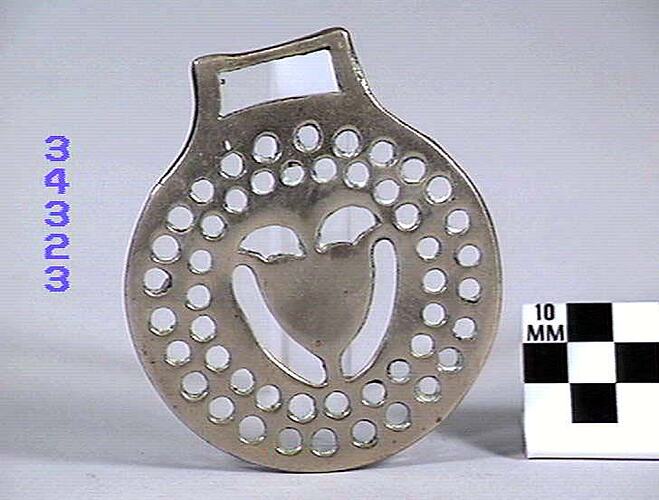 Horse brass depicting an ace of hearts or shield. Border of pierced holes. Design is possibly of gypsy and romany origin. There are fifty two perforations in the border, possibly representing the number of weeks in the year. Type: cast brass. Date: 1825-1939.