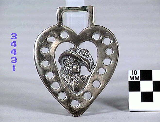 Horse brass depicting a commemorative, Duchess of Devonshire surrounded by a heart shaped border with fifteen perforations in it. Type: cast brass. Date: 1825-1939.