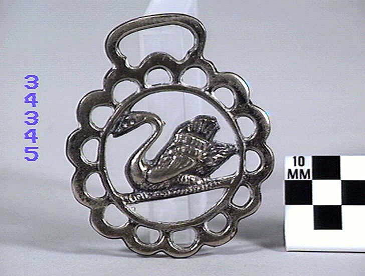 Horse brass depicting a swan sitting at rest. Circular inner border, fourteen perforations and a crenate outer edge. Type: cast brass. Date: 1825-1939.