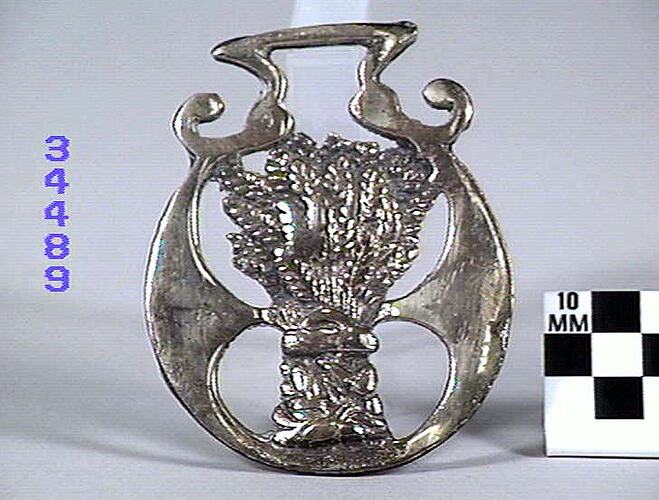 Horse brass depicting a wheatsheaf in a basket. Figure of 8 shaped border. Type: cast brass. Comments: the word "England" is stamped on the back left hand side. Date: 1825-1939.
