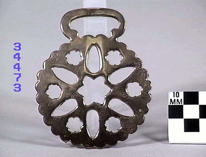 Horse brass depicting a sun disc with six radiating rays and decorative perforations. Crenate border. Type: stamped from the brass plate. Date: 1824-1939.