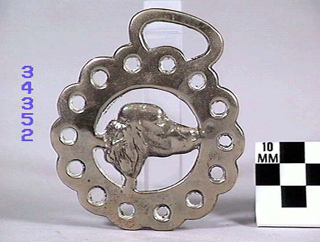 Horse Brass depicting a dog's head, border with fourteen perforations and crenate edge. The dog's head appears to be that of the cocker spaniel breed.Type: cast brass. Date: 1825-1939.