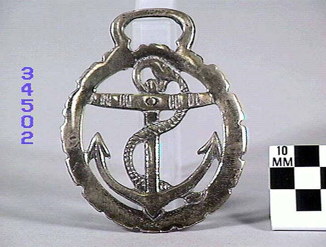 Horse brass depicting an anchor and rope with ansated cross. Circular border with serrated edge. Type: cast brass. Comments: item has remains of two studs on back, possibly from the casting process. This type of brass was found in the harness of horses used for dockyard transport. Date: 1824-1939.