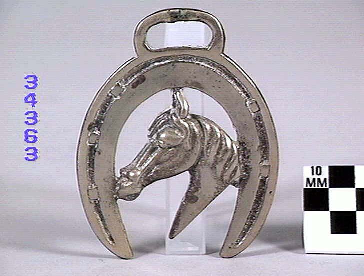 Horse Brass depicting a horse head with horseshoe border. Type: cast brass. Date: 1825-1939.