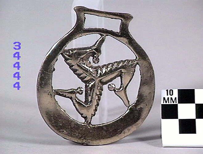 Horse brass depicting the Isle of Man symbol with three legs in armour and wearing spurs. The three legs radiate from a central point each 120 degrees from the next. Type: cast brass. Date: 1825-1939