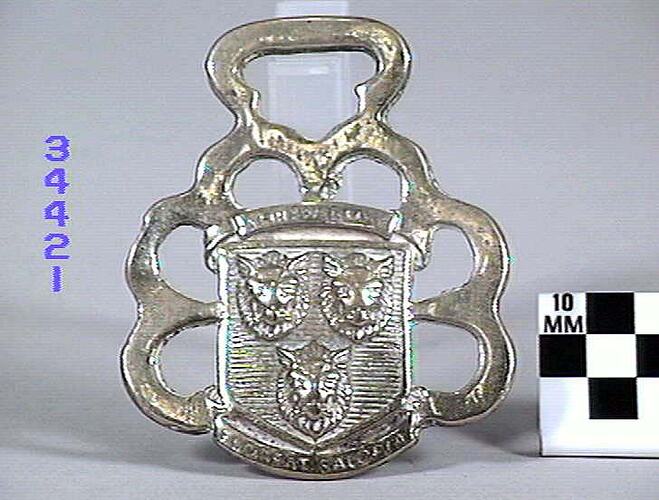 Horse brass possibly depicting Shrewsbury school. Shield and 3 lions. Clover leaf shaped border with 6 perforations. Marked at top "Shrewsbury" and at bottom "Floreat Salopia". Translated this means Shrewsbury flower of Salopia. Type: cast brass. Date: 1825-1939.
