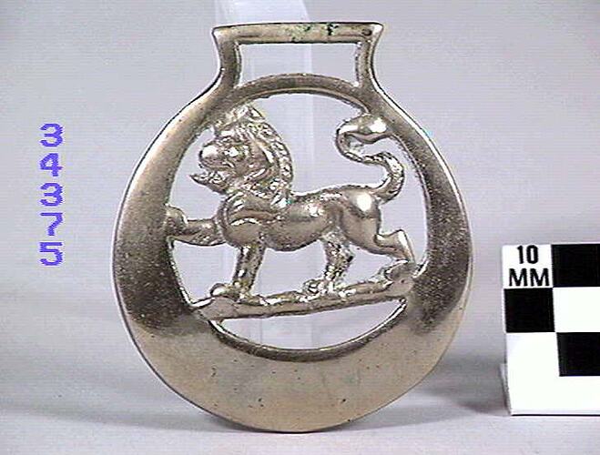 Horse Brass depicting a lion passant. Crescent border. Type: cast brass. Date: 1825-1939.