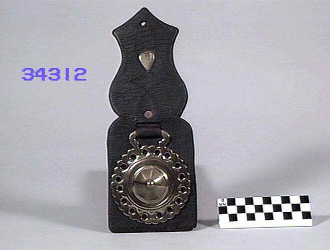 Face piece harness strap with one brass and trim attached. Design: sun disc with raised conical form and perforated border with scalloped edge. Type: cast brass. Date: 1825-1939.