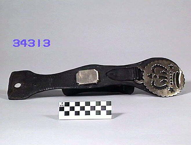 Face piece harness strap with one horse brass and trim. Design: crown with scalloped edge and two stars. The trim is of brass and is an upright rectangle with scalloped out corners. Type: cast brass. Date: 1825-1939.