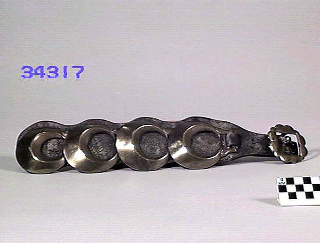 Martingale harness strap with four horse brasses attached. These are of uniform size and attached with a leather strap threaded through from top to bottom. There is a brass buckle at the top. Design: crescent moon. All identical. Type: pressed brass. Date: 1825-1939.