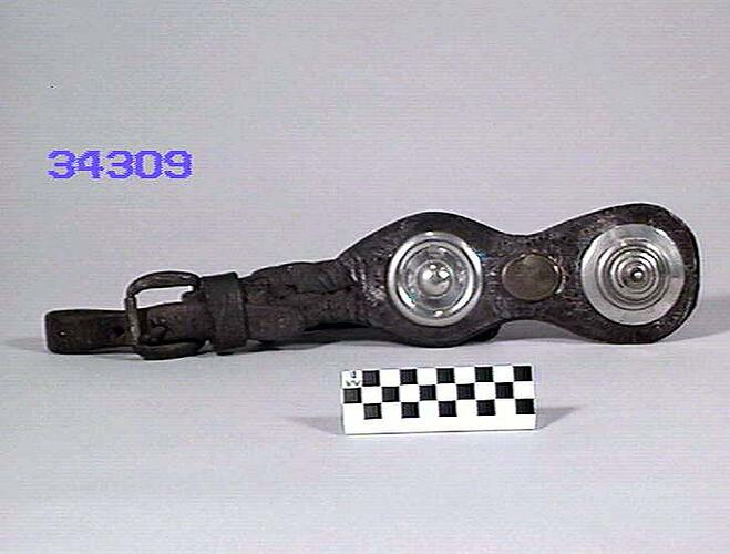 Martingale harness strap with two brasses and one trim attached with wire. Attaching buckle at top.
