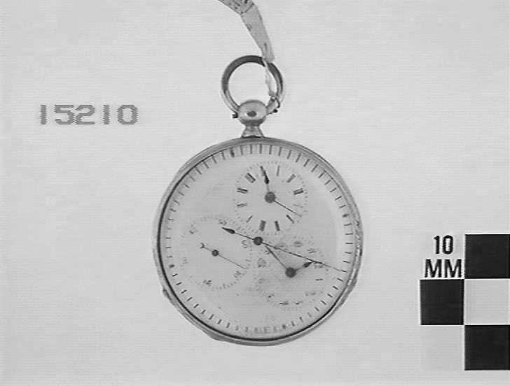 Gold case with shield stamped on back. White enamel dial has three small dials: one has roman numerals, one has arabic numerals (for London and Paris times) and the third is a seconds dial. Sweep hand to show seconds around circumference. Key wound spring; duplex escapement.