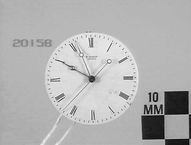 White enamel dial has black roman numerals and a seconds hand at centre of dial. Key wound spring; lever escapement. Jewelled pivots. Scale fast to slow.