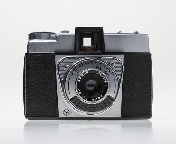 Isoly-Mat medium format viewfinder camera with Agfa Color Agnar f/8 fixed lens with leaf shutter to 1/100 sec, manufactured by Agfa-Gevaert N.V. (Agfa), and introduced in 1960.