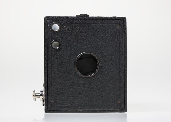 The George Eastman Archive suggests that production dated from 1911-1934. The type of case latch used indicates that this particular camera was likely to have been made before 1917, when a rounded latch was introduced. A piece of paper found inside the camera gives handwritten details, but the date mentioned is 1902. -