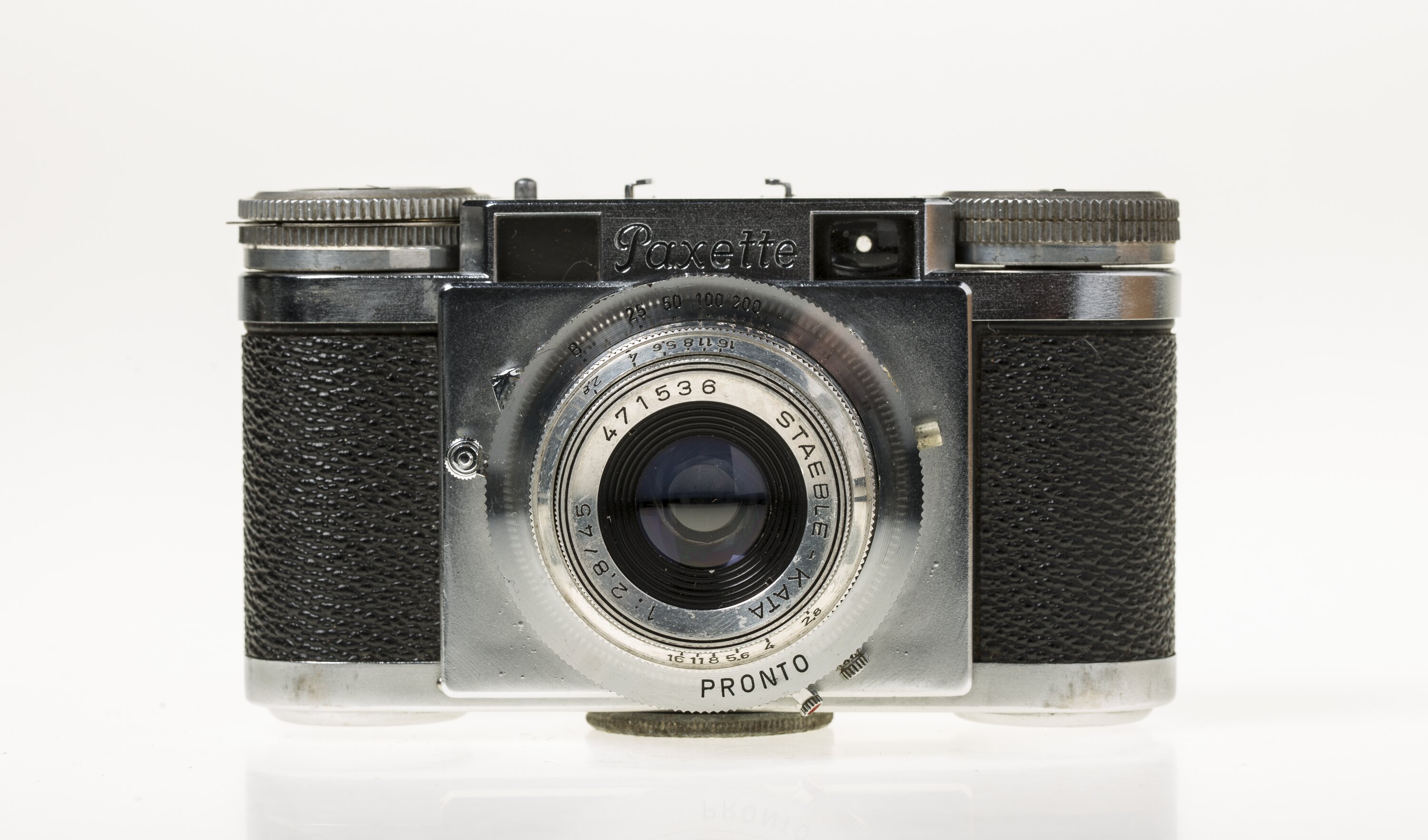 The compact Paxette 35mm rangefinder camera, manufactured by Carl Braun, Camera-Werk, Nuremberg, Germany in the 1950s. It is equipped with a Staeble Kata F1:2.8, 45mm fixed lens with shutter speeds up to 1/200 sec.