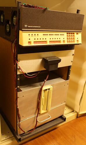 * Processor & Disk Drive: rectangular unit with several sections. * Keyboard: Sloping top rectangular box with wooden sides and QWERTY keyboard on top front. Rear has various inputs/output sockets and mains cable. * Cassette Player: light yellow rectangular case with control knobs, tape counter and cassette pocket. * Cassette: not in case * Double computer connector junction block. * Baud Controller: metal rectangular box with control knob and female plug. * Two Integrated Circuits: white rectangular blocks each with 16 pins * Mains Cord * Five Computer Connectors * Seven Circuit Boards with Components * Box of 5¼"Floppy Disks * Box of Reels of Paper Tape * Documentation * EPROM Module: rectangular metal box with front control panel, and computer connector and cut-off mains lead at rear.