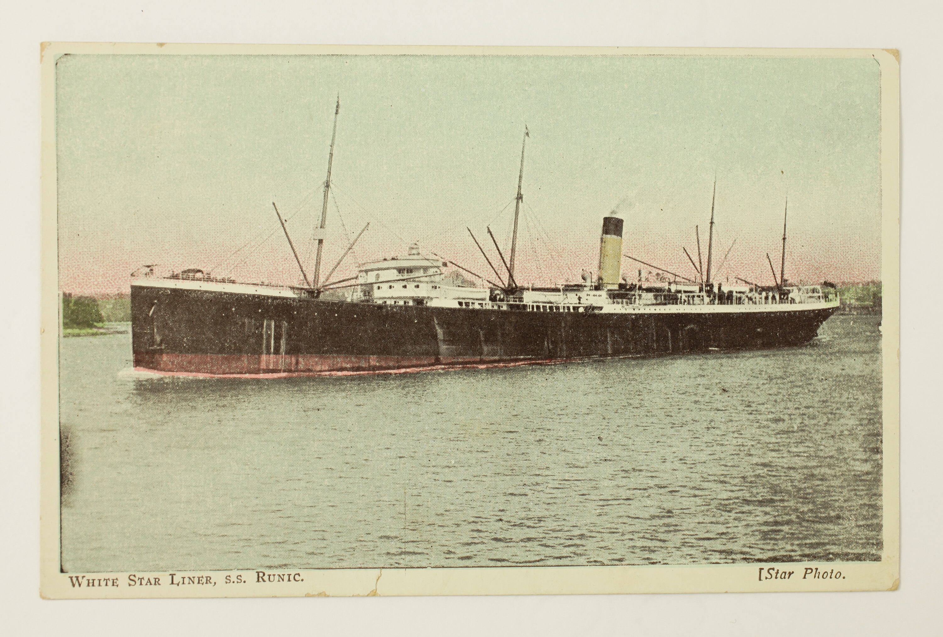 Colour illustration of the White Star Line ship 'Runic' at sea and was signed by 'Curl.' 'Curl' seems to be a reference to John Peile as the return address lists his name and regiment. He writes to his mother around August to September 1915 that he and his brother Albert will 'both come back with honors'. They were both killed in action.