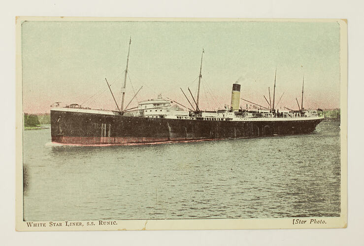Printed on front: 'WHITE STAR LINER, S.S. RUNIC. [Star Photo.' Printed on back: 'POST CARD / ADVANCE AUSTRALIA / THIS SPACE MAY BE USED FOR CORRESPONDENCE. (FOR ADDRESS ONLY)' Printed on back top right corner: 'FOREIGN / 1/2d / INTER-STATE / 1d' Handwritten on back: 'Dear Mother / It is hard enough for me to write this short / note to tell you I could not get home. We have been going / for our lives not a moment to spare they are rushing us / away this week end not to much ? either but we / will pull out on top. I was in the hospital for 9 days / but alright now. I was in Sydney for a couple of days / with Albert. I got my photo taken they are not bad / I will forward them on as soon as I can. I hope I / can strike Albert over there but it will be a fluke / I hope mum you are not worrying to [sic] much because / we will both come back with honors hoping you / are in good health' Hand-written on back, top left corner: 'the boat on the / other side is the / one we sail / on' Hand-written on the back, along the top: 'With fondest love from your / forgetful son Curl' Hand-written on the back, top right corner: 'Address / J. Peile Private / 8th reinforce / 2 Battal / Liverpool'