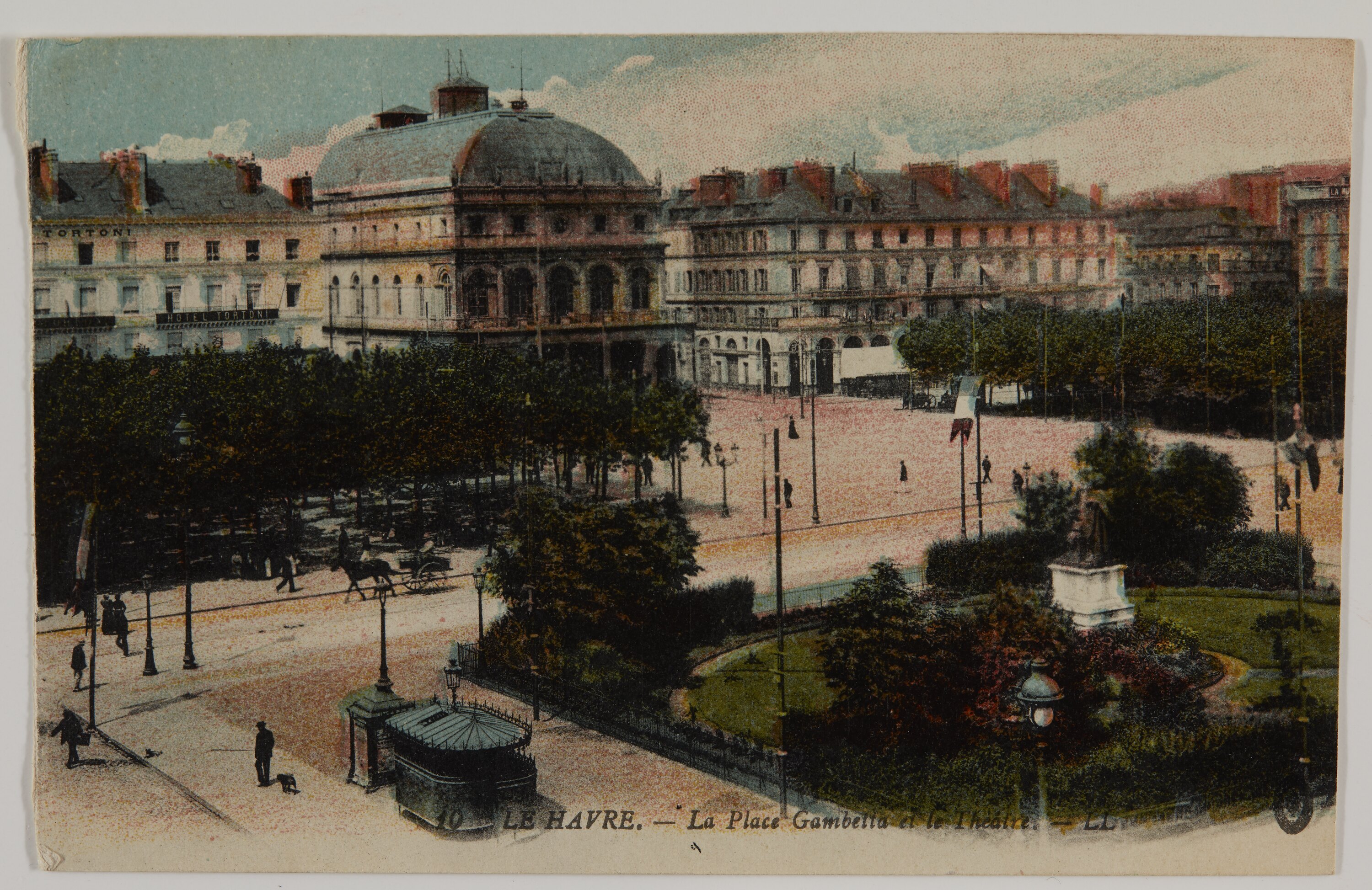 Colour illustration of 'Le Place Gambetta et le Theatre' in the port city of Le Havre, France.