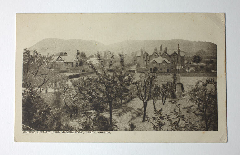 Printed on front: 'CARADOC & HELMETH FROM MADEIRA WALK, CHURCH STRETTON.' Printed on back: 'POST CARD / THE SEAL OF ARTISTIC / SERIES / BRITISH EXCELLENCE / CORRESPONDENCE ADDRESS' Printed on back top right corner: 'AFFIX / STAMP' Handwritten on back: '3/1/18 / from Curl to Flo with / the very best of love & good wishes from your / fond Brother Curl / am quite well myself' Printed vertically on back centre: 'PRINTED IN ENGLAND.' Printed vertically on back left: 'Published by F. Adlard, 24, Stanford Avenue, Church Stretton.'