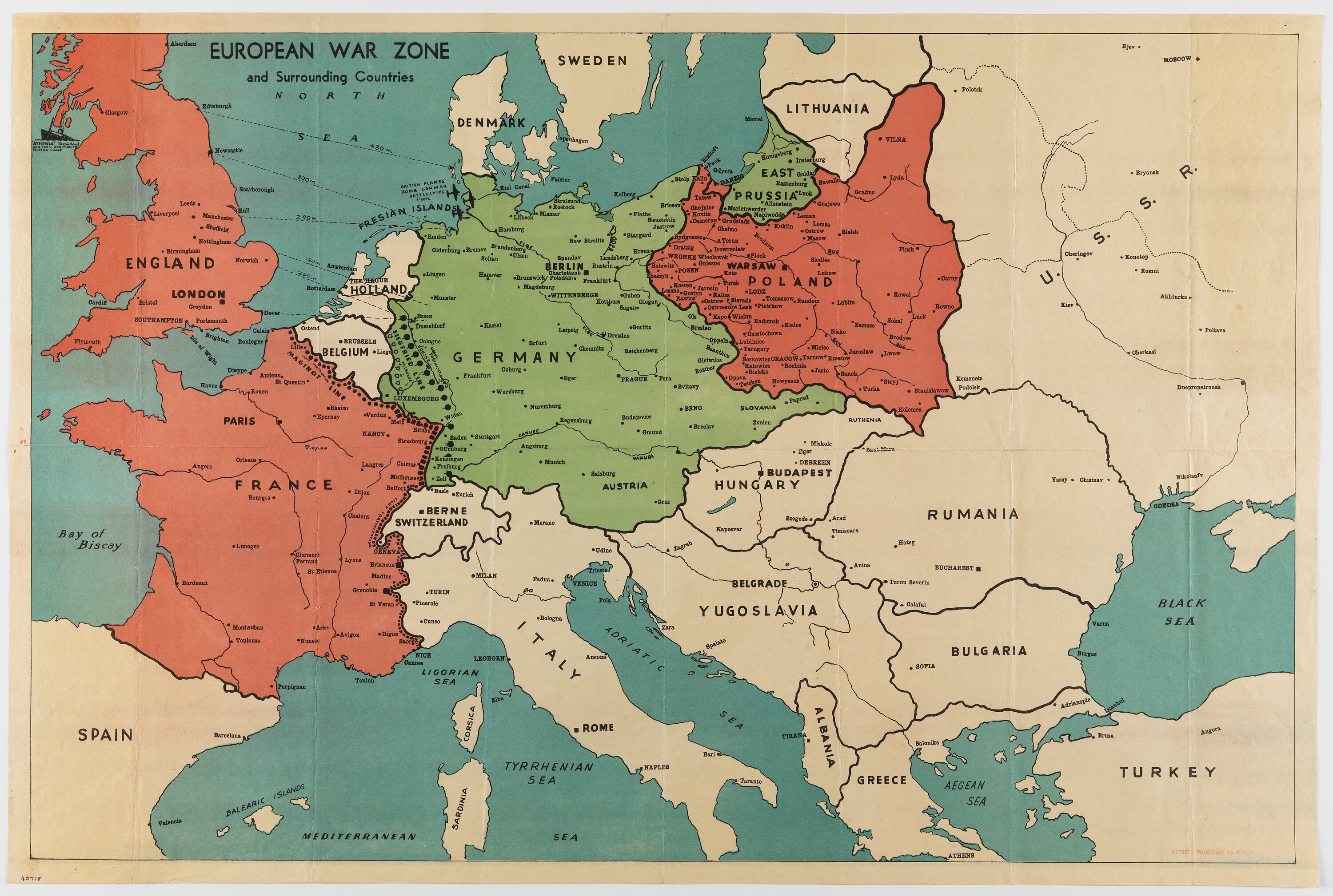 Printed colour map with Poland, England and France shaded pink and Germany green. Surrounding countries are unshaded and surrounding bodies of water are blue. Lines of fortification are marked by black dotted lines. Details include World War II-era planes and a partially-sunk ship, The Athena.