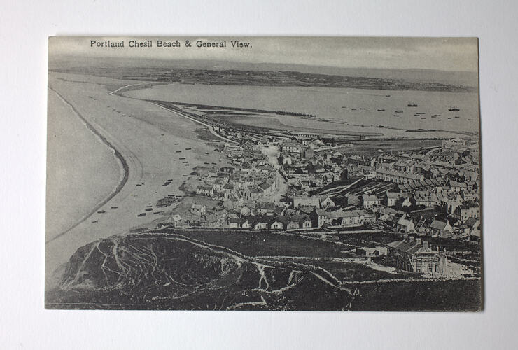 Printed on front: 'Portland Chesil Beach and General View.' Printed on back: 'POST CARD. / CORRESPONDENCE ADDRESS' Printed on back top right corner: 'INLAND / POSTAGE / 1/2d. / FOREIGN / POSTAGE / 1d.' Handwritten on back: 'With best love from / Curl / one of Englands famous Beaches / I have had a few hours / enjoyment here' Printed vertically on back left: 'E.H. Series. Printed in England'