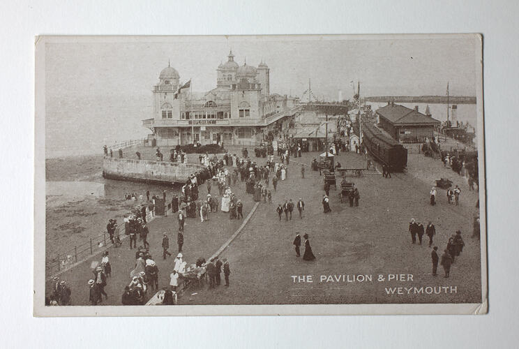 Black and white photograph of the pavilion and pier at Weymouth in Dorset, England. Part of a collection of material relating to the World War I service of brothers John and Albert Victor Peile. The postcard is signed by 'Curl.' 'Curl' seems to be a reference to John Peile as the return address listed on ST 40698 has his name and regiment.