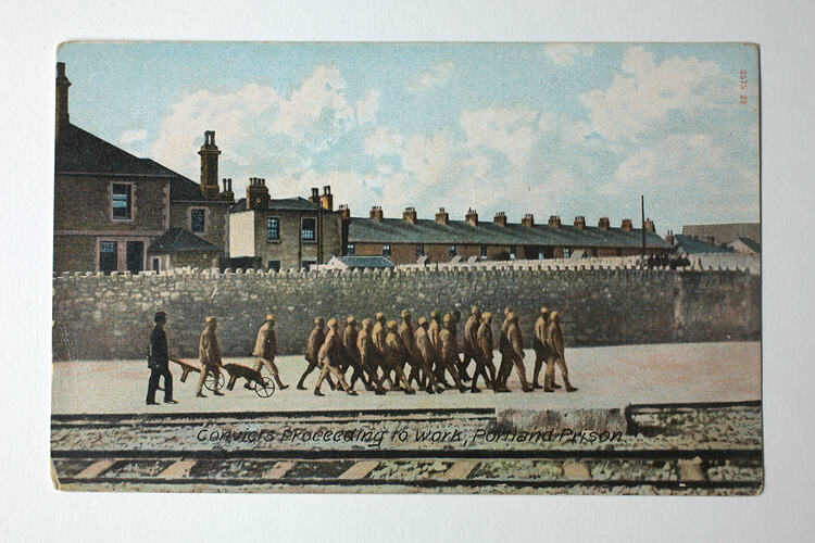 Printed on front: 'Convicts Proceeding to work, Portland prison' Printed vertically on front right: '2575 22' Printed on back: 'POST CARD' Handwritten on back: 'from Curl[?] to Dad / with love / this is one of Englands / famous Prisons'
